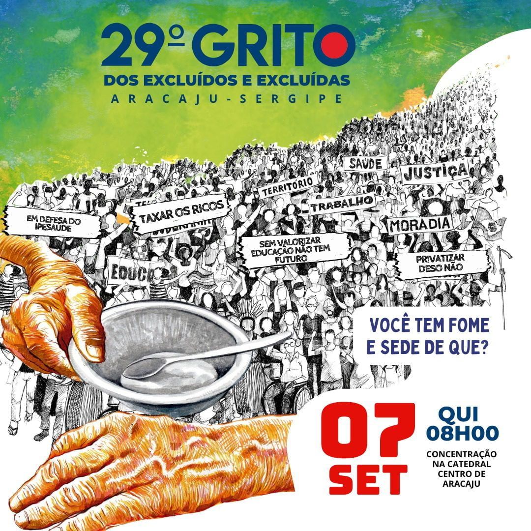 Com o tema ‘Você tem fome e sede de quê?’, a concentração do 29º Grito dos Excluídos será na Catedral Metropolitana de Aracaju, às 8h da manhã, com Ato Ecumênico e atividades culturais. Em seguida, os manifestantes sairão em caminhada pelas ruas do Centro de Aracaju até a Pça da Bandeira.