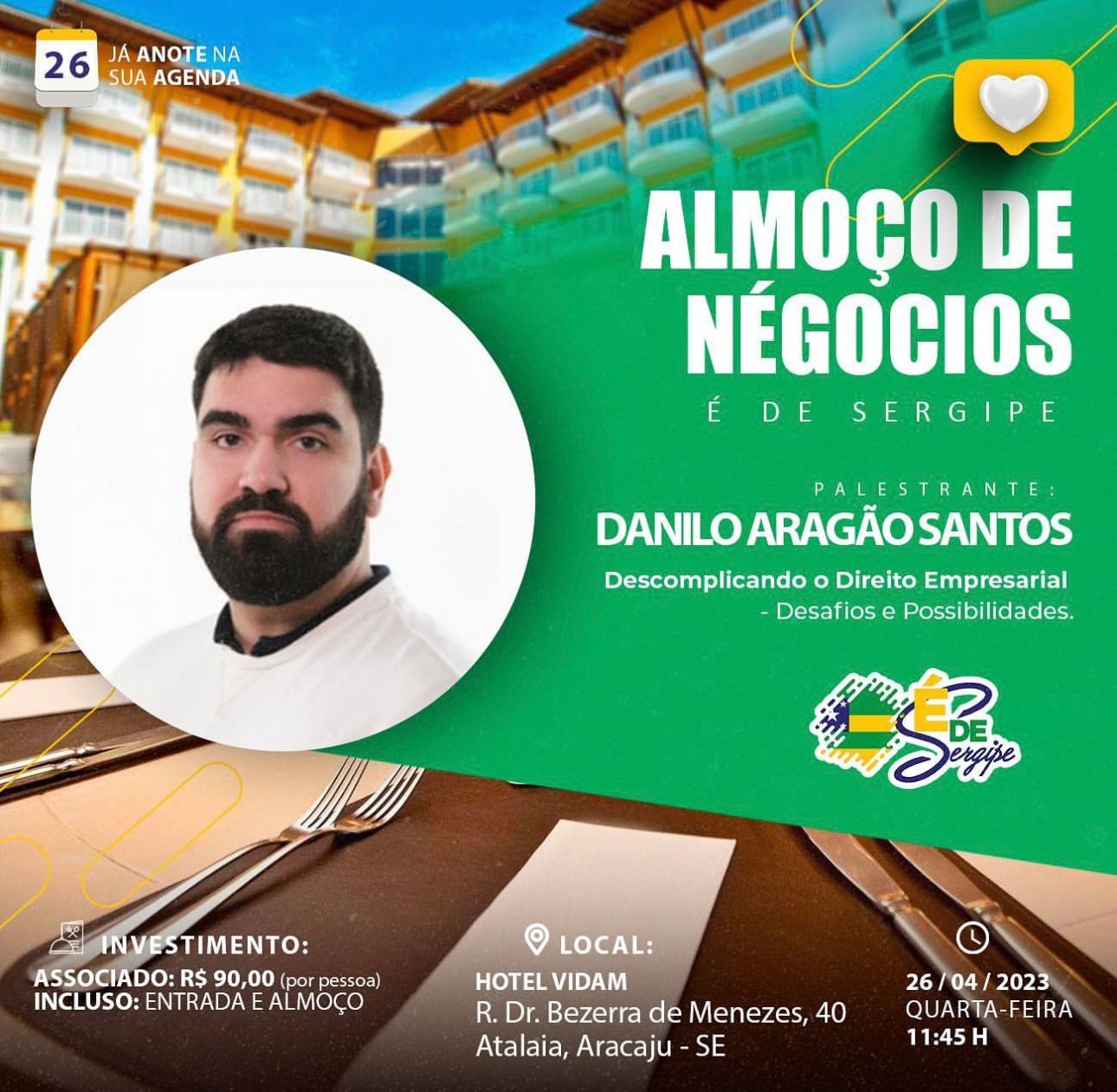 O assunto “Direito Empresarial” é de suma importância para que os empresários e empreendedores saibam sobre os seus direitos em caso de qualquer problema. E este vai ser o tema do Almoço de Negócios do Movimento “É de Sergipe”, que terá mais uma edição neste mês de abril. Será na próxima quarta, 26 de abril, a partir das 11h45 no restaurante do Vidam Hotel, na Orla da Atalaia. O palestrante é o advogado Danilo Aragão, sócio da DAS Advogados, com escritório em São Paulo.