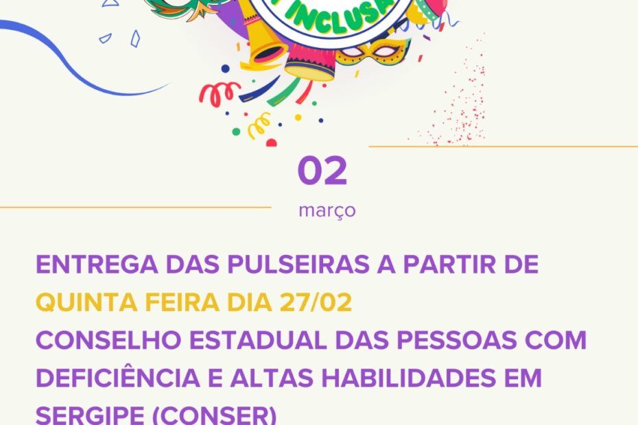A entrega das pulseiras de acesso começa na nesta quinta-feira, 27 de fevereiro, no Conselho Estadual das Pessoas com Deficiência e Altas Habilidades de Sergipe (Conser), localizado no Edifício Maria Feliciana, 3º andar.