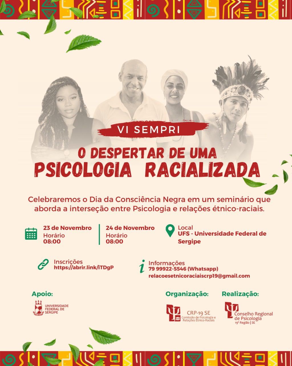 Com o tema “O despertar de uma psicologia racializada”, o evento, que acontece na Universidade Federal de Sergipe – campus São Cristóvão – tem como objetivos mobilizar reflexões e a sensibilização da sociedade e da própria categoria de Psicólogas(os) e estudantes sobre Psicologia e as relações étnico-raciais; celebrar o Dia da Consciência Negra como pauta em defesa de uma Psicologia antirracista; fomentar a discussão sobre a Psicologia antirracista e salientar a importância da atuação profissional de psicólogas nessa temática.