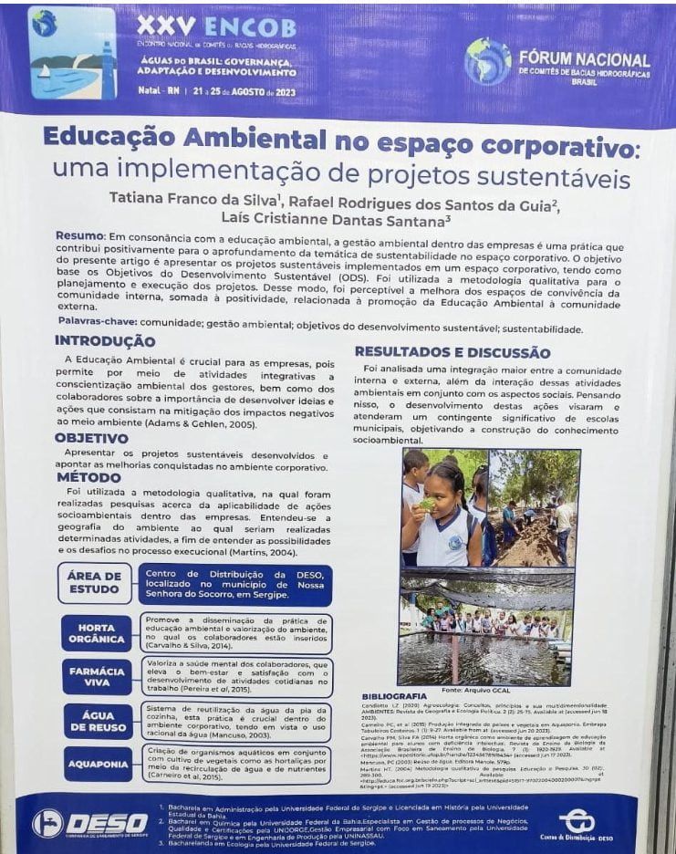 Durante o evento, as Jornadas promovidas pela GCAL promoveram discussões abrangentes, abarcando diversos tópicos que contribuirão para a constante melhoria de seus processos e projetos. Dois trabalhos especialmente notáveis foram apresentados no ENCOB deste ano. O primeiro, intitulado “Educação Ambiental no Espaço Corporativo: Uma Implementação de Projetos Sustentáveis“, foi apresentado por Tatiana Franco. O segundo, intitulado “Implantação da Horta Orgânica como Instrumento de Sensibilização à Mudança de Cultura ESG em uma Empresa Pública“, teve Rafael Guia como palestrante.