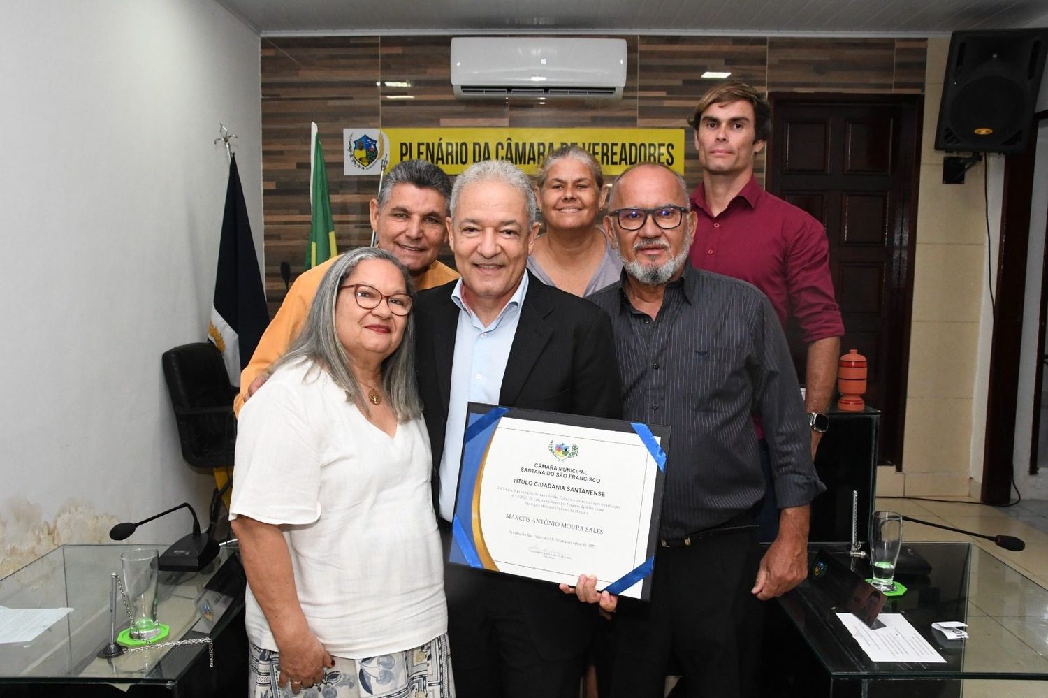 O Diretor Regional do Senac, Marcos Sales, foi agraciado, na sexta sexta-feira, 01 de dezembro, com o Título de Cidadão Santanense. A outorga foi proposta pelo Vereador Valdson da Silva Costa e aprovada por unanimidade por seus pares. A cerimônia realizada na Câmara de Vereadores do município, reuniu parlamentares, amigos e familiares e destacou o empenho de Marcos Sales na região com ações de educação inclusiva com foco no comércio, bens e serviços, eixos de atuação do Senac.