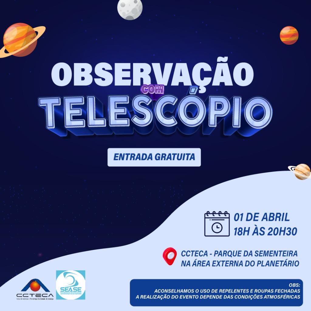 A Casa de Ciência e Tecnologia da Cidade de Aracaju (CCTECA) Galileu Galilei e a Sociedade de Estudos Astronômicos de Sergipe (Sease) estão organizando um evento gratuito de observação da Lua e dos planetas Vênus e Marte com reconhecimentos neste sábado, dia 1º. O evento acontecerá na área externa do Parque Augusto Franco (Sementeira), no bairro Jardins, das 18h às 20h30.