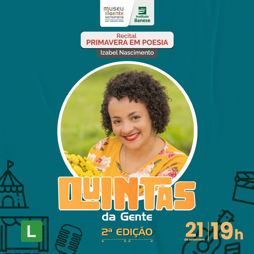 Na próxima quinta, dia 21, às 19h, a segunda edição do projeto Quintas da Gente abrirá nova temporada de apresentações para o público. No auditório do Museu da Gente Sergipana, espaço disponibilizado para ocupação pelos artistas, conforme edital de seleção, a cordelista Izabel Nascimento apresentará o Recital Primavera em Poesia, em parceria com o músico Denisson Cleber e participações especiais.