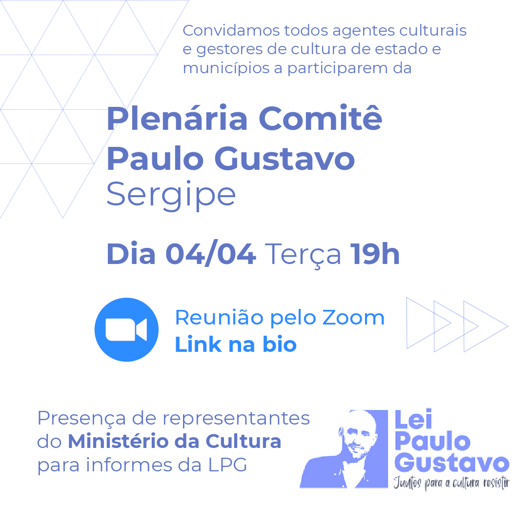 No dia 04/04/2023 às 19h, o Comitê Paulo Gustavo Sergipe promove uma plenária com a presença de representantes do Ministério da Cultura para informar sobre o andamento da execução da Lei Complementar 195/2022, mais conhecida como Lei Paulo Gustavo. Confirmaram a presença de representantes do Conselho Estadual de Cultura (CEC) e da Fundação Aperipê de Cultura e Arte (FUNCAP).