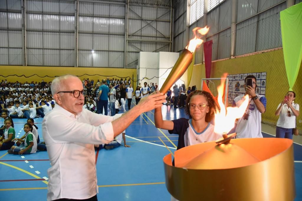“Este é um momento de grande alegria para todos nós. Pedi, pessoalmente, ao secretário da Educação para que voltássemos a realizar esta importante competição, que movimenta a nossa rede de forma tão especial. A primeira edição dos Jogos Escolares aconteceu em 2019, mas infelizmente, em virtude da pandemia do novo coronavírus, precisamos suspender nos últimos anos. Hoje, ele está de volta, para estimular a prática esportiva pelos estudantes e para incentivá-los a desenvolver as suas habilidades. Fico muito feliz com a participação expressiva dos nossos estudantes neste evento que ajuda na formação e na disciplina.Tenho certeza de que eles farão bonito”, afirmou o prefeito após acender a pira olímpica acompanhado da estudante Alana Mikaela Fontes Santos, da Escola Municipal de Ensino Fundamental (Emef) Professor José Antônio da Costa Melo.