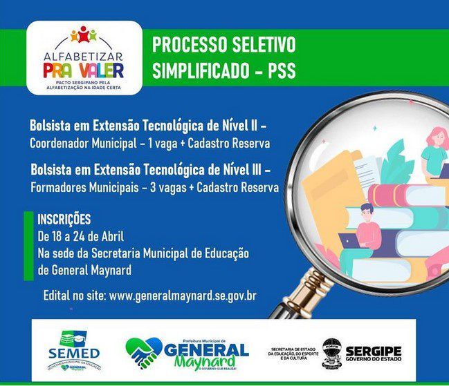 Seguem até a próxima segunda-feira, 24, as inscrições para o Processo Seletivo Simplificado do Programa Alfabetizar Pra Valer. A ação é direcionada a Bolsistas de Extensão Tecnológica de Nível II – Coordenadores Municipais e Bolsistas de Extensão Tecnológica de Nível III e Formadores Municipais no âmbito do Programa Alfabetizar Pra Valer.