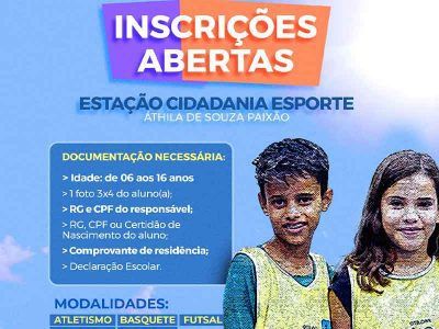 A Prefeitura de Lagarto, por meio da Secretaria Municipal da Juventude e do Esporte – SEJESP, informa que já se encontram abertas as inscrições para quem deseja praticar uma das modalidades oferecidas pela Estação Cidadania – Esporte Athila de Souza Paixão.