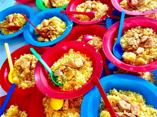 E a merenda é cuidadosamente servida aos nossos estudantes. Tem sopa, macarronada, arroz de galinha, cuscuz, carne moída, arroz doce, mungunzá, frutas, salada de verduras e legumes, biscoitos, suco, feijão com carne, frango… ufa!