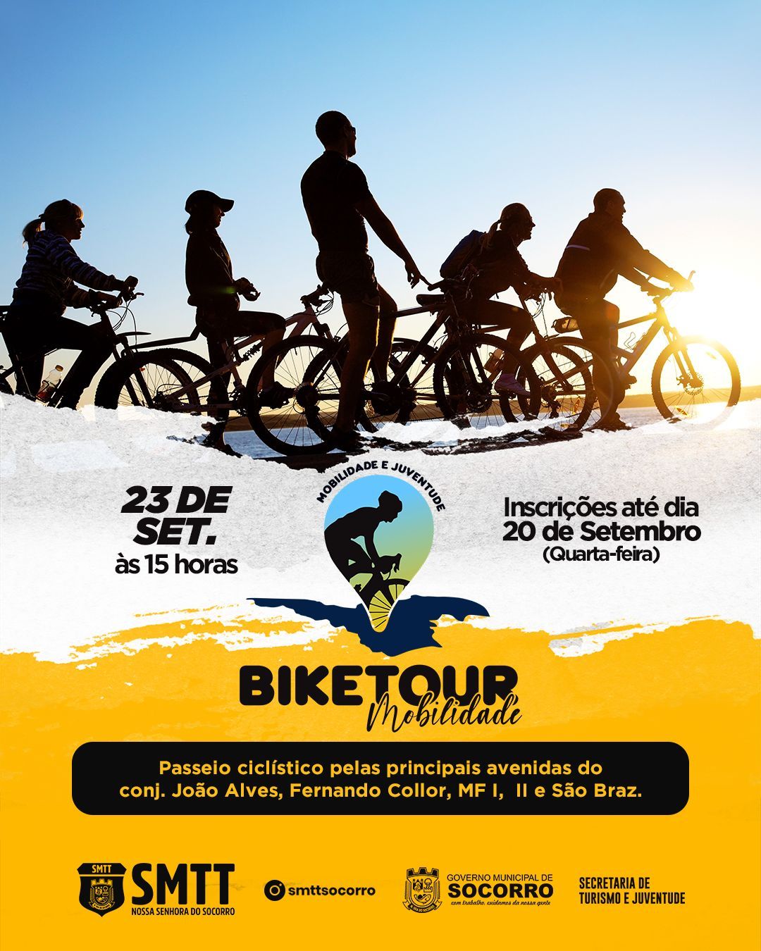 A Prefeitura de Nossa Senhora do Socorro, em parceria com a Superintendência Municipal de Trânsito e Transporte (SMTT), a Secretaria Municipal de Turismo e Juventude, a Secretaria Municipal de Saúde (SMS) e a Guarda Municipal de Socorro (GMS), está prestes a promover o aguardado Bike Tour Mobilidade. Este evento, que visa incentivar o uso da bicicleta como meio de transporte sustentável, acontecerá no próximo dia 23, com concentração marcada para as 15 horas na Arena Siri e saída programada às 15h30.