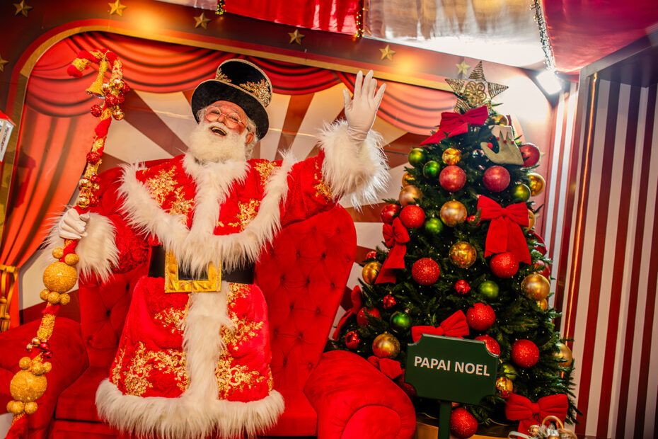 Imagem do Papai Noel em pé e de braços abertos em frente ao trono dele no Shopping Jardins