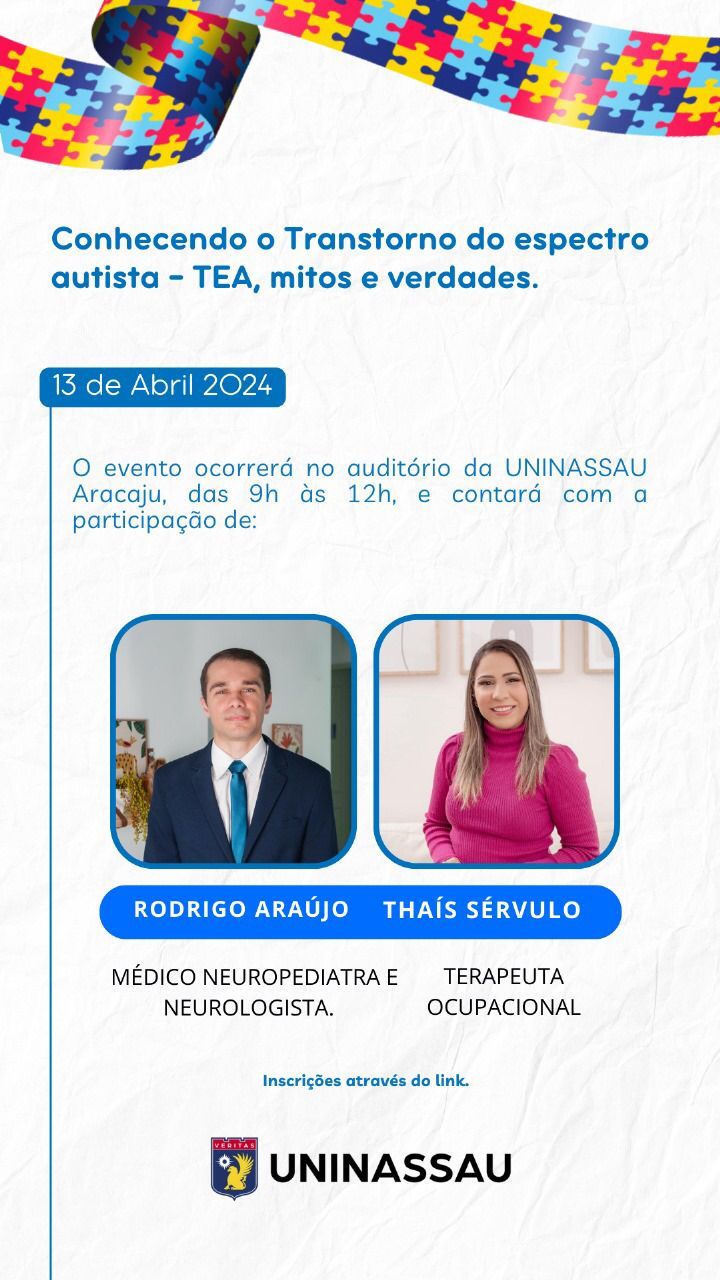 O UNINASSAU – Centro Universitário Maurício de Nassau Aracaju promove o evento “Conhecendo o Transtorno do Espectro Autista (TEA) – mitos e verdades”. A ação acontece neste sábado (13), às 9h, na própria Instituição, localizada na Avenida Augusto Franco – 2340, Siqueira Campos.