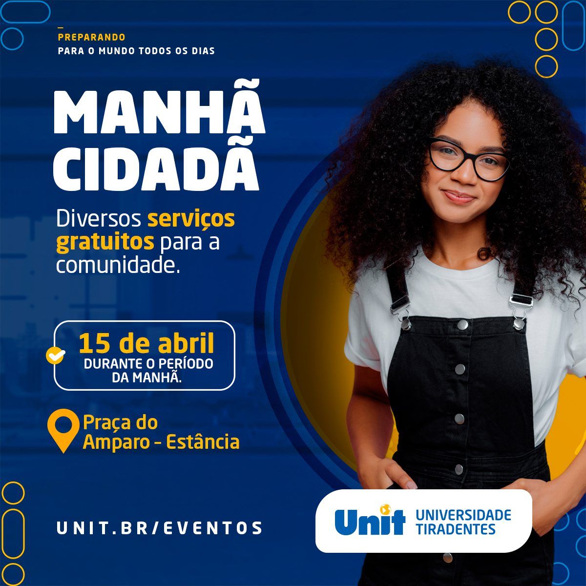 A Universidade Tiradentes realizará mais uma edição da Manhã Cidadã na Praça Barão do Rio Branco, na Praça do Amparo (Rua Dr. Vicente Portela), em Estância/SE, das 8h às 13h, do dia 15 de abril (sábado). O projeto é realizado anualmente, envolvendo os cursos de Direito, Enfermagem, Medicina e de Educação à Distância (EaD), com o objetivo de levar cidadania à população carente no município. A expectativa é de que sejam atendidas mais de 300 pessoas.